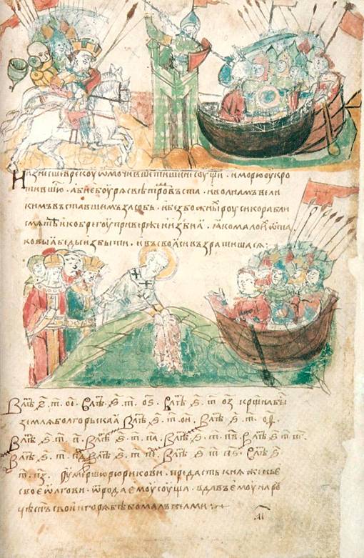 relations After the Rus' attack on Constantinople in 860, the Byzantine Patriarch Photius sent missionaries north to convert the Rus' and the Slavs. Prince Rastislav of Moravia had requested the Emperor to provide teachers to interpret the holy scriptures, so in 863 the brothers Cyril and Methodius were sent as missionaries, due to their knowledge of the Slavonic language. The Slavs had no written language, so the brothers devised the Glagolitic alphabet, later developed into Cyrillic, and standardized the language of the Slavs, later known as Old Church Slavonic. They translated portions of the Bible and drafted the first Slavic civil code and other documents, and the language and texts spread throughout Slavic territories, including Kievan Rus’. The mission of Cyril and Methodius served both evangelical and diplomatic purposes, spreading Byzantine cultural influence in support of imperial foreign policy. In 867 the Patriarch announced that the Rus' had accepted a bishop, and in 874 he speaks of an "Archbishop of the Rus'." Relations between the Rus' and Byzantines became more complex after Oleg took control over Kiev, reflecting commercial, cultural, and military concerns. The wealth and income of the Rus' depended heavily upon trade with Byzantium. Constantine Porphyrogenitus described the annual course of the princes of Kiev, collecting tribute from client tribes, assembling the product into a flotilla of hundreds of boats, conducting them down the Dnieper to the Black Sea, and sailing to the estuary of the Dniester, the Danube delta, and on to Constantinople. On their return trip they would carry silk fabrics, spices, wine, and fruit. The importance of this trade relationship led to military action when disputes arose. The Primary Chronicle reports that the Rus' attacked Constantinople again in 907, probably to secure trade access. The Chronicle glorifies the military prowess and shrewdness of Oleg, an account imbued with legendary detail. Byzantine sources do not mention the attack, but a pair of treaties in 907 and 911 set forth a trade agreement with the Rus', the terms suggesting pressure on the Byzantines, who granted the Rus' quarters and supplies for their merchants and tax-free trading privileges in Constantinople. In 941, Igor led another major Rus' attack on Constantinople, probably over trading rights again. A navy of 10,000 vessels, including Pecheneg allies, landed on the Bithynian coast and devastated the Asiatic shore of the Bosphorus.The attack was well-timed, perhaps due to intelligence, as the Byzantine fleet was occupied with the Arabs in the Mediterranean, and the bulk of its army was stationed in the east. The Rus’ burned towns, churches, and monasteries, butchering the people and amassing booty. The emperor arranged for a small group of retired ships to be outfitted with Greek fire throwers and sent them out to meet the Rus’, luring them into surrounding the contingent before unleashing the Greek fire. Liutprand of Cremona wrote that "the Rus', seeing the flames, jumped overboard, preferring water to fire. Some sank, weighed down by the weight of their breastplates and helmets; others caught fire." Those captured were beheaded. The ploy dispelled the Rus’ fleet, but their attacks continued into the hinterland as far as Nicomedia, with many atrocities reported as victims were crucified and set up for use as targets. At last a Byzantine army arrived from the Balkans to drive the Rus' back, and a naval contingent reportedly destroyed much of the Rus' fleet on its return voyage (possibly an exaggeration since the Rus' soon mounted another attack). The outcome indicates increased military might by Byzantium since 911, suggesting a shift in the balance of power. Igor returned to Kiev keen for revenge. He assembled a large force of warriors from among neighboring Slavs and Pecheneg allies, and sent for reinforcements of Varangians from “beyond the sea.” In 944 the Rus' force advanced again on the Greeks, by land and sea, and a Byzantine force from Cherson responded. The Emperor sent gifts and offered tribute in lieu of war, and the Rus' accepted. Envoys were sent between the Rus’, the Byzantines, and the Bulgarians in 945, and a peace treaty was completed. The agreement again focused on trade, but this time with terms less favorable to the Rus’, including stringent regulations on the conduct of Rus’ merchants in Cherson and Constantinople and specific punishments for violations of the law. The Byzantines may have been motivated to enter the treaty out of concern of a prolonged alliance of the Rus', Pechenegs, and Bulgarians against them, though the more favorable terms further suggest a shift in power. Reign of Vladimir and Christianisation It is not clearly documented when the title of the Grand Duke was first introduced, but the importance of the Kiev principality was recognized after the death of Sviatoslav I in 972 and the ensuing struggle between Vladimir the Great and Yaropolk I. The region of Kiev dominated the state of Kievan Rus' for the next two centuries. The Grand Prince (velikiy kniaz') of Kiev controlled the lands around the city, and his formally subordinate relatives ruled the other cities and paid him tribute. The zenith of the state's power came during the reigns of Vladimir the Great (980–1015) and Prince Yaroslav I the Wise (1019–1054). Both rulers continued the steady expansion of Kievan Rus' that had begun under Oleg. Vladimir had been prince of Novgorod when his father Sviatoslav I died in 972. He was forced to flee to Scandinavia in 976 after his half-brother Yaropolk had murdered his other brother Oleg and taken control of Rus. In Scandinavia, with the help of his relative Earl Hĺkon Sigurdsson, ruler of Norway, Vladimir assembled a viking army and reconquered Novgorod and Kiev from Yaropolk. As Prince of Kiev, Vladimir's most notable achievement was the Christianization of Kievan Rus', a process that began in 988. The P